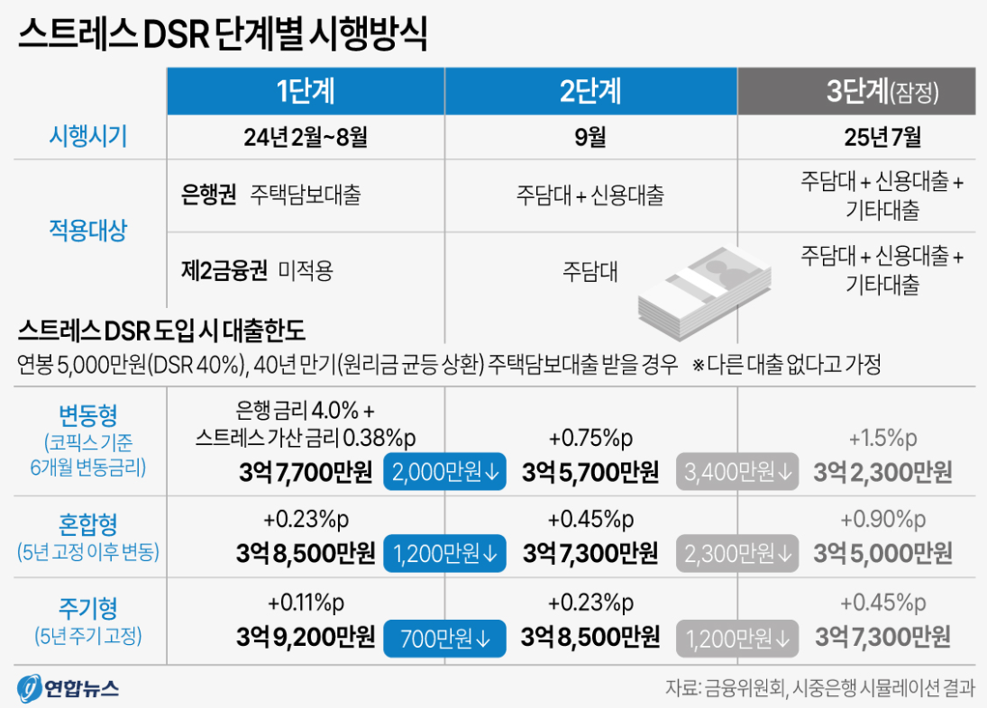 이 규제는 2024년 2월에 1단계 시행을 했으며 24년 9월에 2단계, 그리고 25년 7월에 3단계 스트레스 DSR을 시행할 예정입니다.