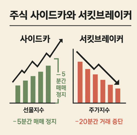 주식 사이드카와 서킷브레이커는 모두 급격한 가격 변동 시 주식시장의 안정을 도모하는 장치지만, 적용 대상과 작동 방식에서 뚜렷한 차이를 보입니다. 사이드카는 선물시장에 기반한 프로그램 매매에 작동하는 제도이며, 선물지수가 기준 이상 급등 또는 급락하면 프로그램 매도 또는 매수를 5분간 중단시킵니다. 즉, 선물 시장에서 발생한 급격한 가격 변화를 그대로 현물시장으로 전이되지 않도록 일시적인 '완충장치' 역할을 수행합니다.