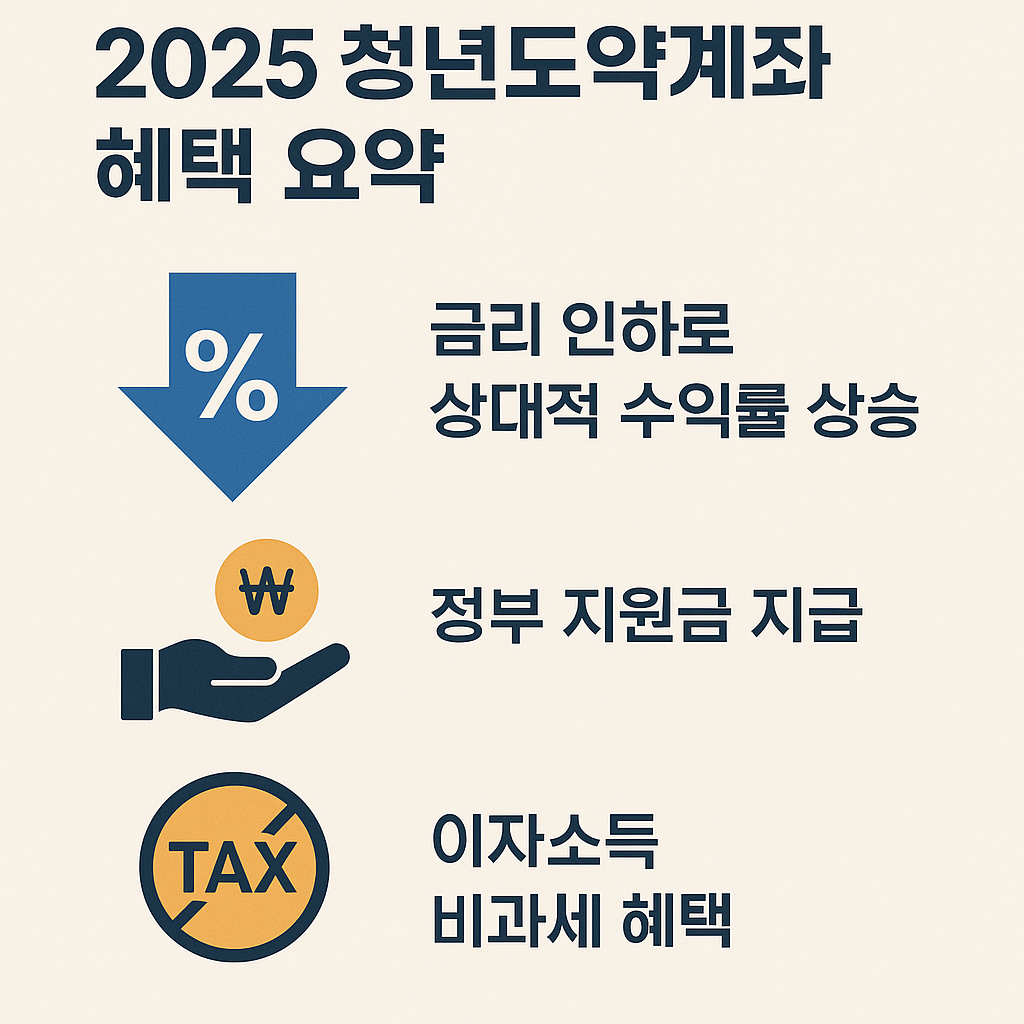 2025년 들어 한국은행은 경기 침체 우려와 내수 부양을 위해 기준금리를 인하했습니다. 이에 따라 시중은행의 예·적금 금리는 대부분 하락세를 보이고 있습니다. 일반 금융상품의 금리가 2%대에 머무르는 상황에서 청년도약계좌는 상대적으로 높은 수익률을 유지하며 주목받고 있습니다. 정부 지원금과 비과세 혜택 덕분에 실질 수익률이 5% 이상인 경우도 있어, 금리 인하 시기에 더욱 매력적인 선택지로 부상했습니다.
